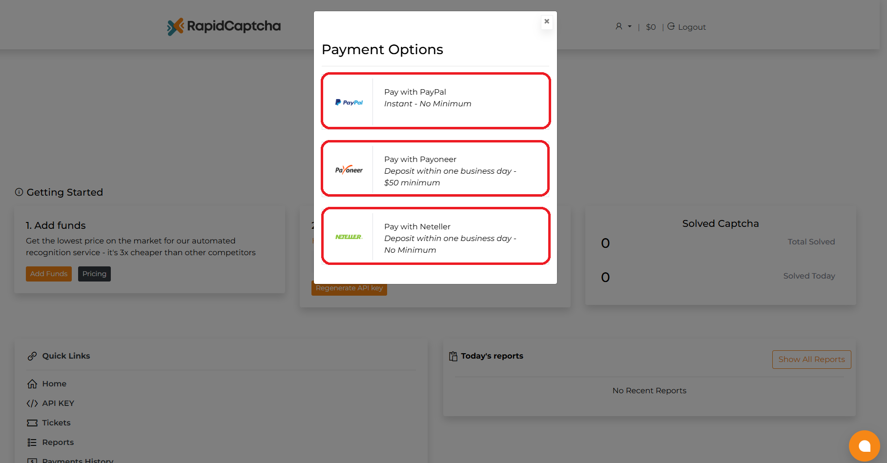 Select your payment method and complete the transaction to top up your account. If your preferred method isn’t listed, contact RapidCaptcha’s support team through their ticket system for assistance.