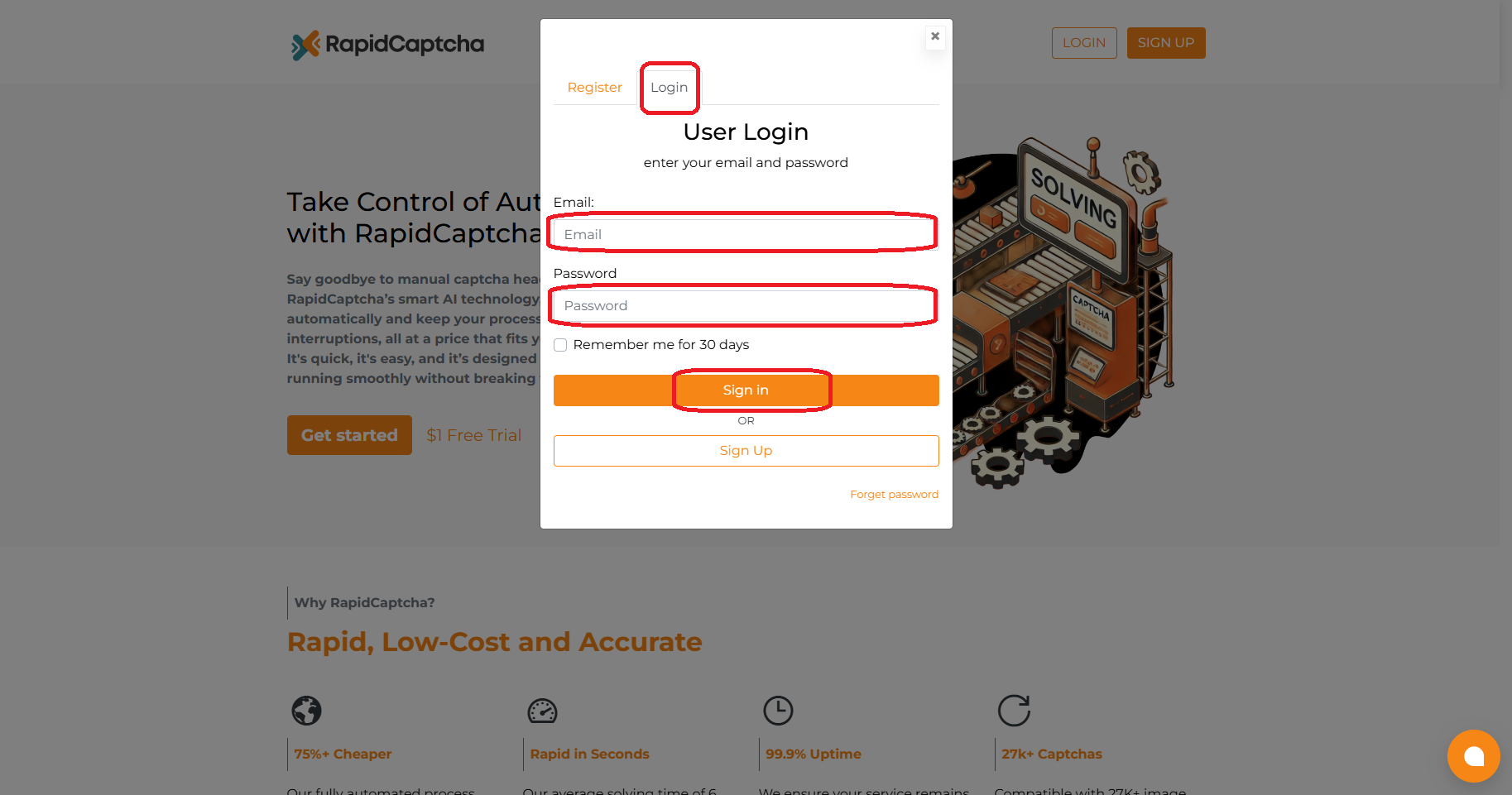 log in to RapidCaptcha, enter your email and password on the login page, then click "Sign in" to access your account.